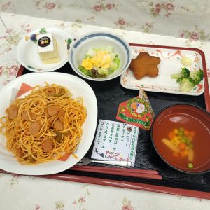 本日25日はクリスマスですね。昼食にはクリスマスケーキを提供いたしました。