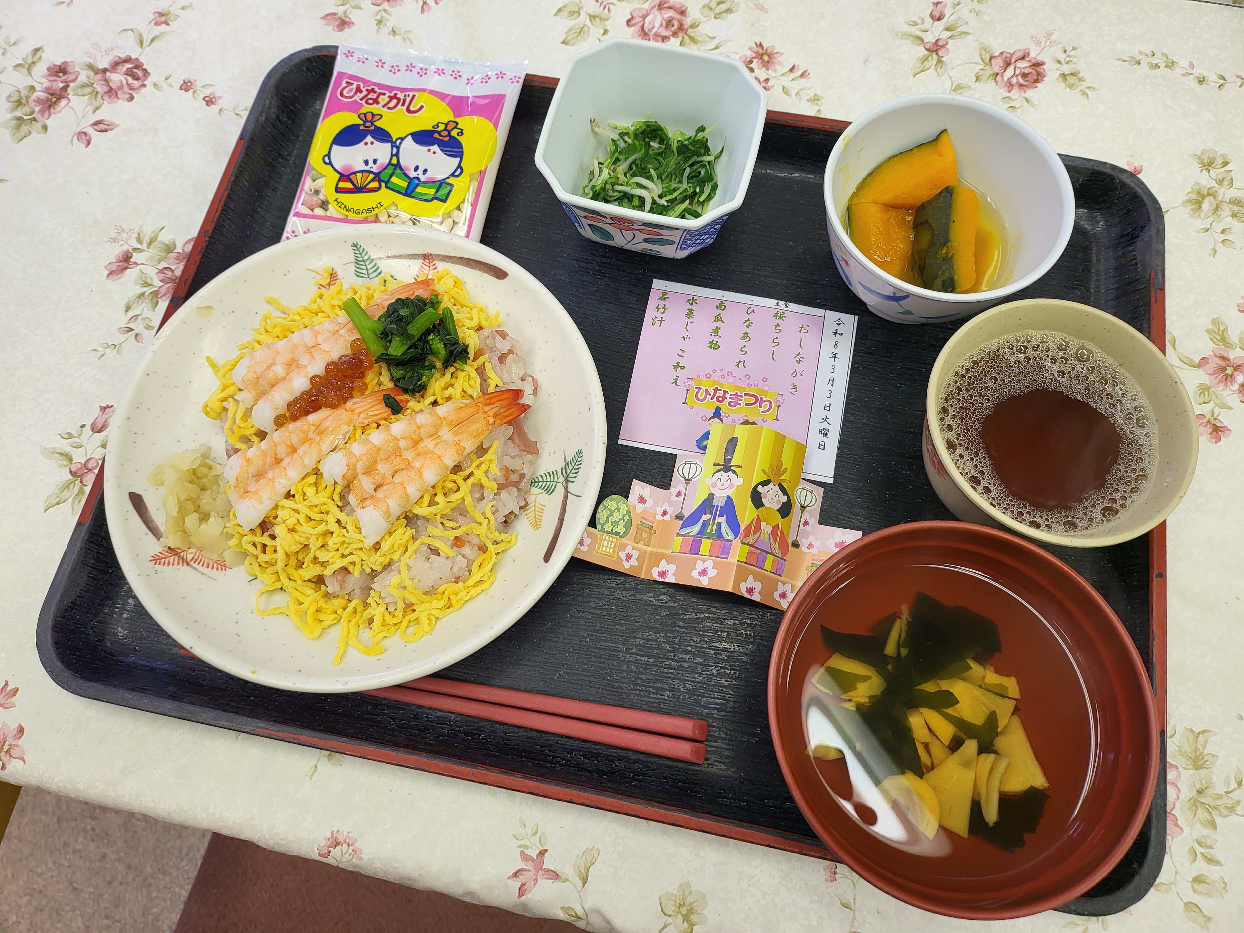 本日は、3月3日ひな祭りで昼食にちらし寿司を提供いたしました。